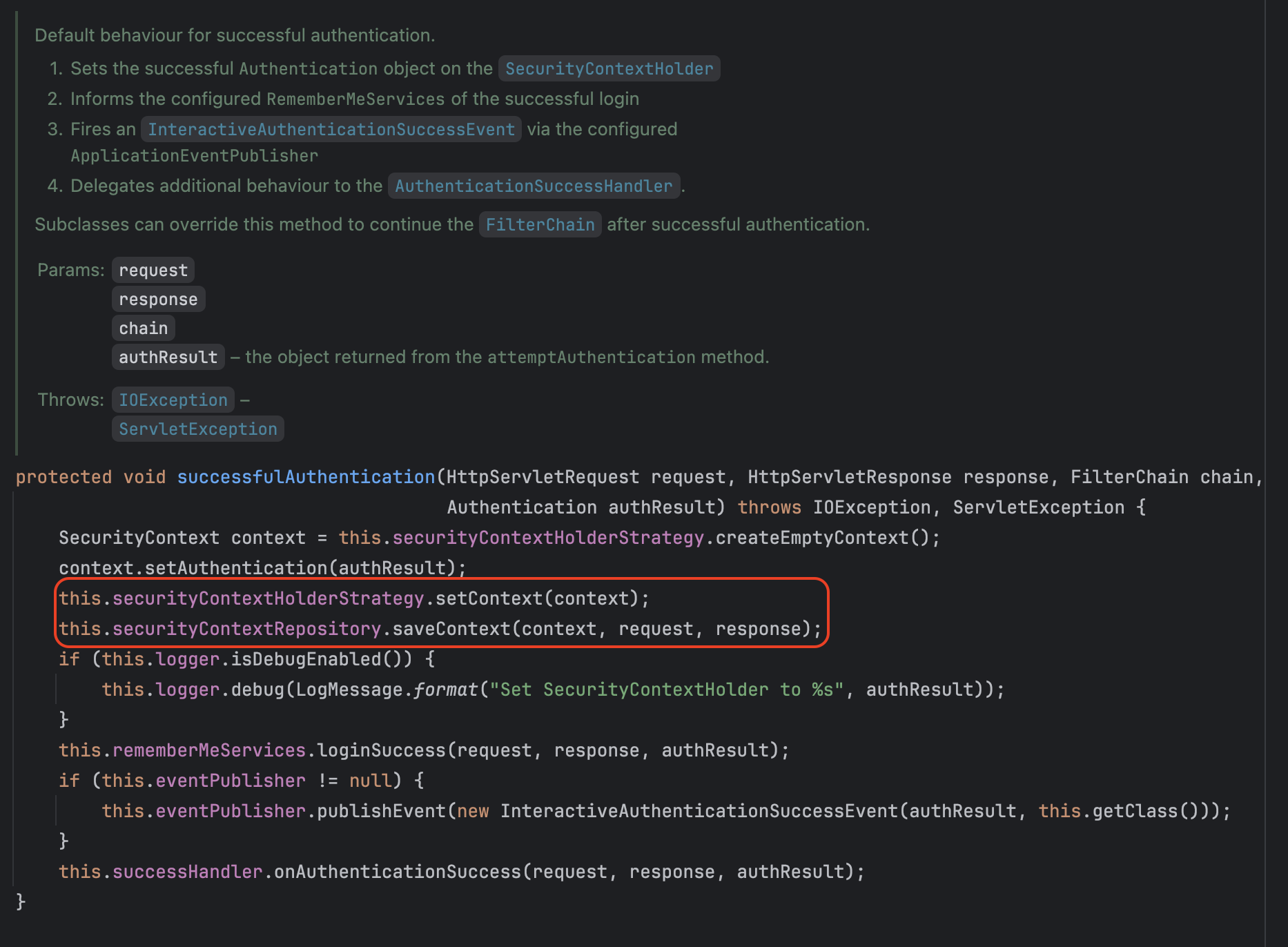 이후 인증 성공 시 Spring Security은 명시적으로 SecurityContext를 저장하는 코드를 활용함으로써 SecurityContext를 저장합니다.