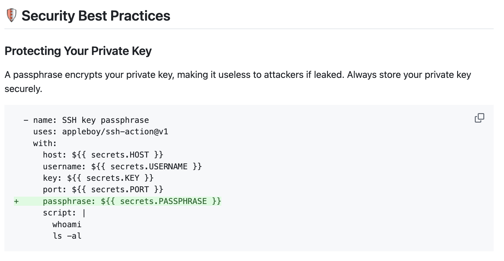 이는 비밀키가 PASSPHRASE에 넣은 비밀키로 암호화되어 ssh-action 서버 / 컨테이너로 전송되기 때문에 통신내용이 노출되어도 비밀키 자체는 노출되지 않는 다는 것을 의미합니다.